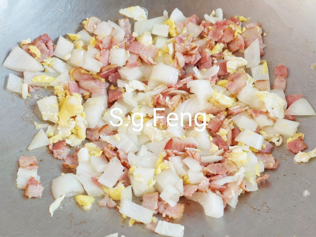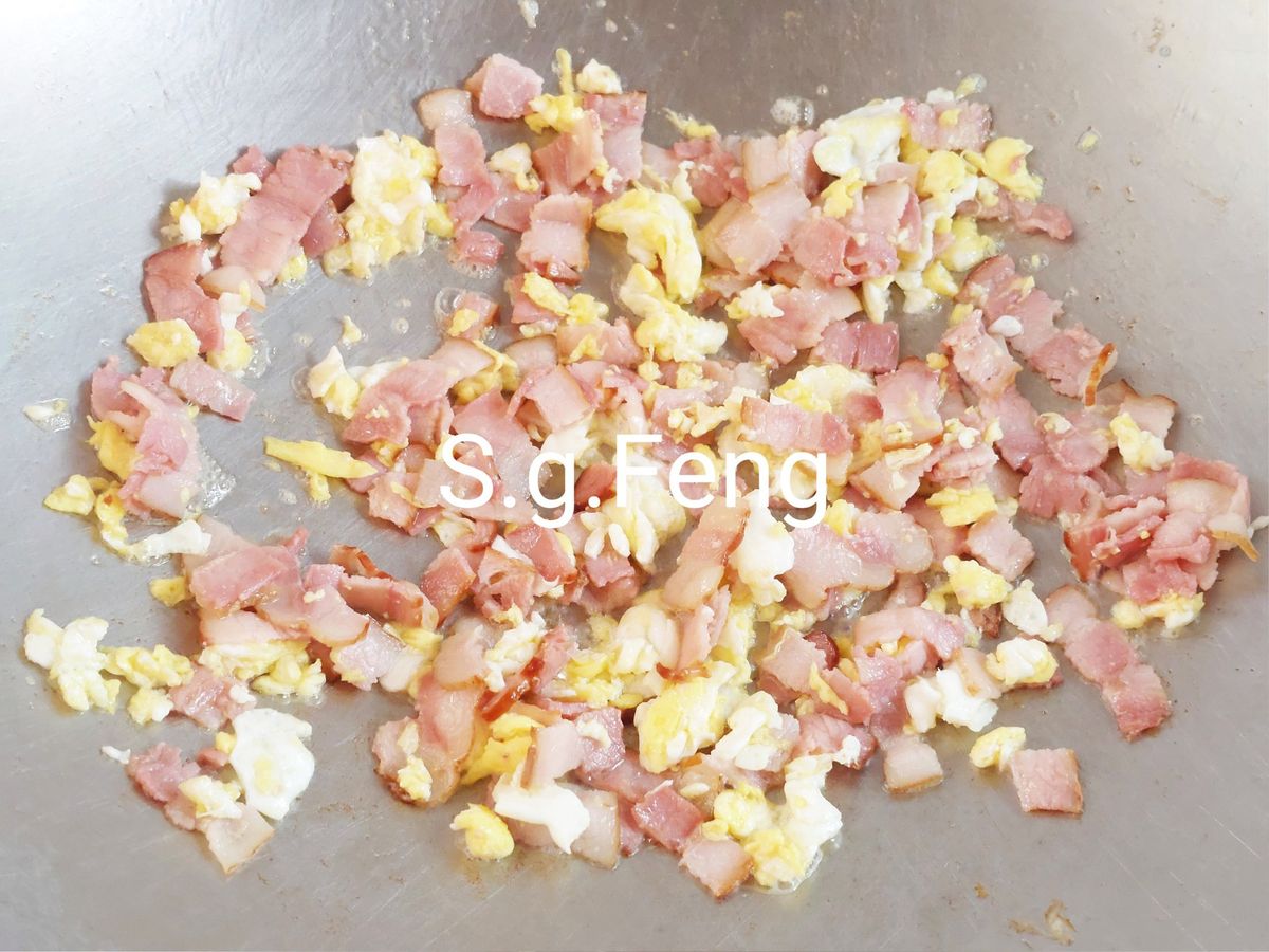 4.加入蛋,在鍋中快速攪拌打散,至蛋凝固有蛋香出來。