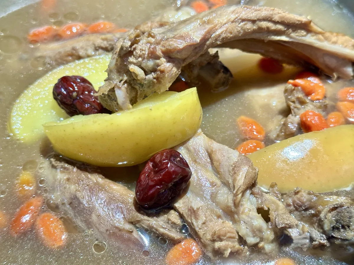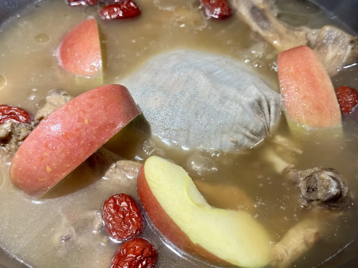 ●排骨燉50分可以看一下,是不是兩端骨頭連接處肉有往內縮,這代表排骨已燉熟,再把紅棗、蘋果塊跟調味料加進來,再次蓋鍋維持小火燉10分鐘。 ※調味料我加醬油替代鹽,這樣滋味挺好的。