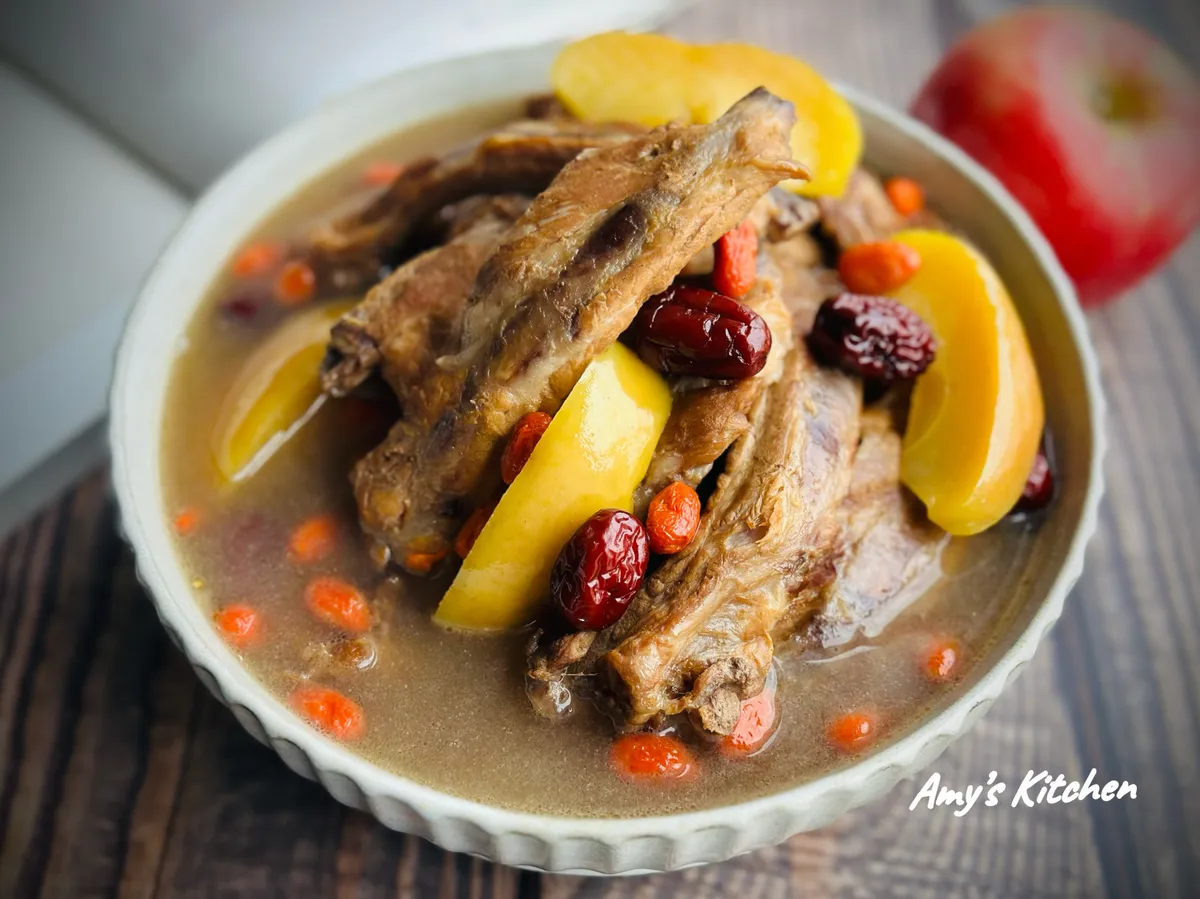 大口喝湯大口啃排骨再加上燉煮過鬆甜的蘋果,冷冷的天溫潤的湯暖胃也暖身。 ※如果懶得顧爐火,也可以將川燙洗淨後的排骨跟所有的材料放電鍋外鍋兩杯水燉煮。